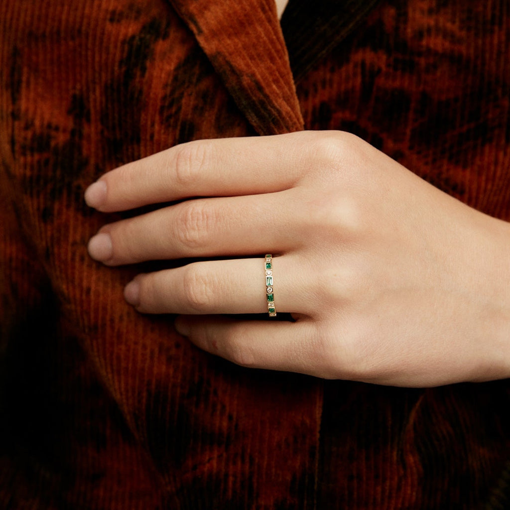 Anillo de oro amarillo de 9K con esmeraldas verdes y diamantes
