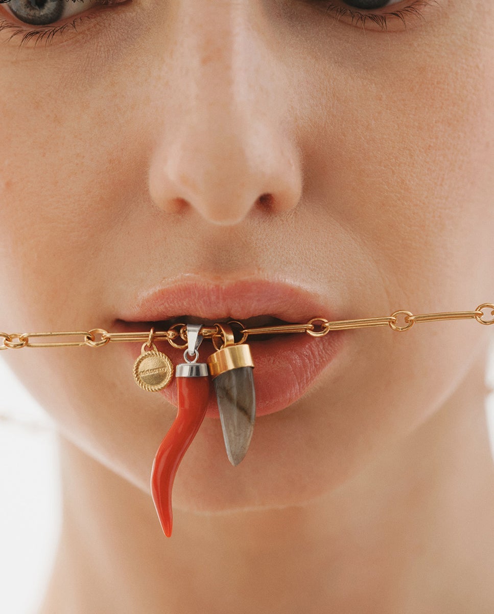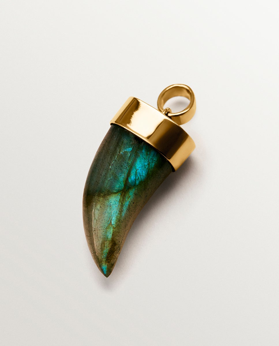 Charm de plata 925 bañada en oro de 18K con labradorita en forma de colmillo