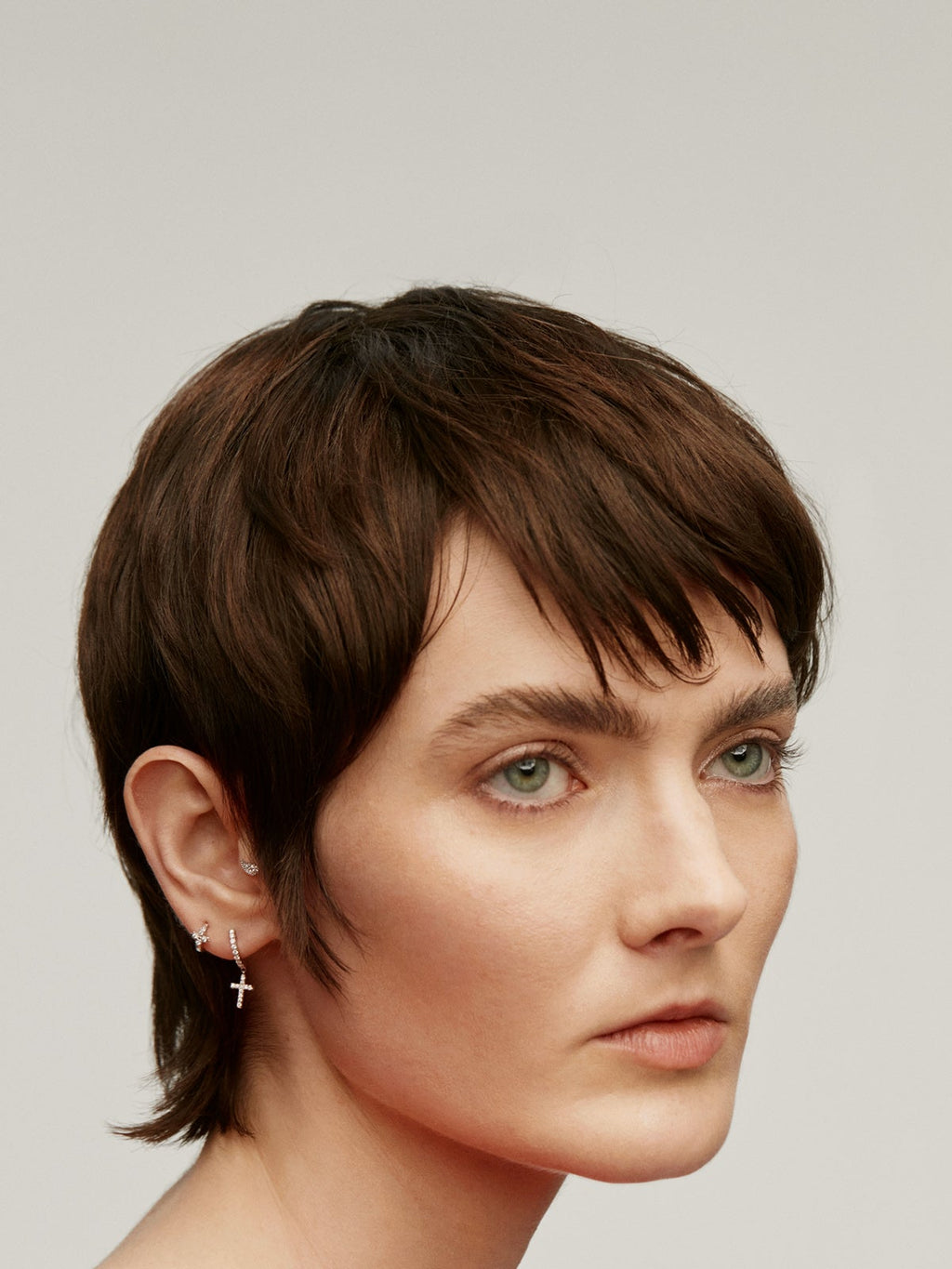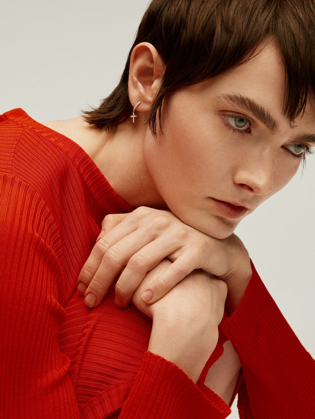 Pendiente individual de oro blanco de 18K con diamantes y cruz