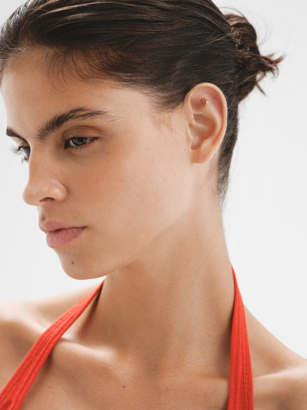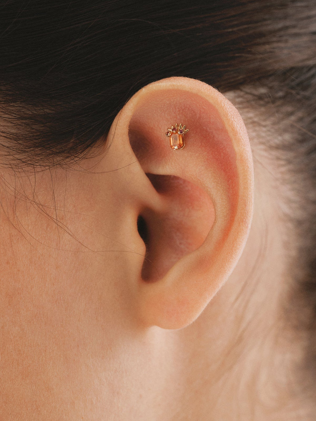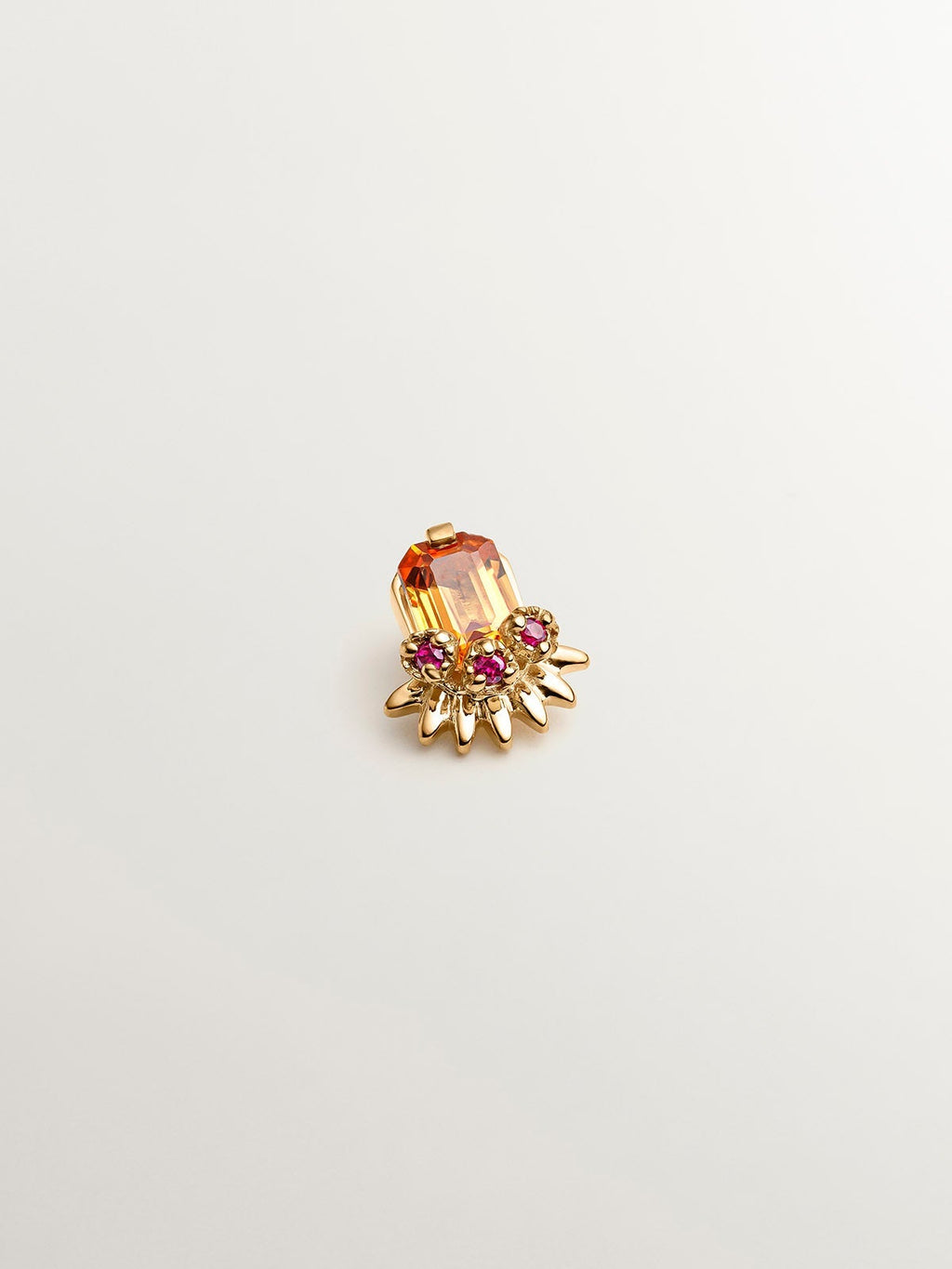 Piercing de oro amarillo de 18K con zafiro naranja central y rubíes rosas